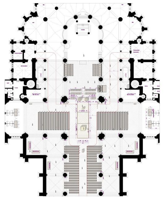 Der Plan zeigt die künftige liturgische Hauptzone in der Vierung: Gemeindebänke und Leitungssitze bilden von vier Seiten das äußere Spannungsfeld, in dessen Zentrum Altar und Ambo wie die Brennpunkte einer Ellipse stehen. Hinter den Leitungssitzen schließt sich die beruhigte Zone für die Dommusik bzw. für Stundengebet und Meditationsgottesdienste an.