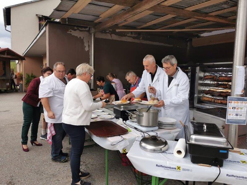Wieder in Begleitung der TMK zog die ganze Feiergemeinde weiter ins Abelenzium, wo alles schon vorbereitet war. Stefan Feistritzer mit seinem Team hatte Hendl und Almbraten gegrillt, die Männer und Frauen in der Schank waren bereit, und konnten die hungrigen Gäste mit Getränken und Essen versorgen – auch das vegetarische Currygemüse kam gut an. Nachdem die meisten gegessen hatten, hatten die Minis ein Schätzspiel vorbereitet: Zu schätzen gab es die Summe der Tage, die alle 21 heutigen Minis zusammen alt sind. Den 79.280 Tagen kam Maria Nagler am nächsten, sie gewann den Hauptpreis, aber auch viele andere durften sich noch einen Preis aussuchen – danke allen Sponsoren für die Großzügigkeit. Für Kinder gab es eigene Preise, sie schätzten das Alter in Jahren. Ein Programm für die Kinder hatte das Fachteam Kinderliturgie vorbereitet, mit vielen Spielen und Bastelmöglichkeiten bis hin zu einer Süßigkeitenwurfmaschine. Für Kaffee und Kuchen nach der Hauptspeise sorgte die KFB mit vielen Kuchenbäckerinnen. Getränke gab es am Nachmittag nur noch in der Seidlbar. Die Jungscharleiter sperrten erst um 13:30 Uhr die Wein- und Spritzerbar auf, dafür machten sie abends den Abschluss. Es war ein gelungenes Fest, für das allen Helfern und Helferinnen, sowie allen Sponsor:innen herzlich gedankt sei.