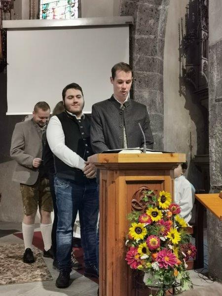 Es war wie angekündigt kalt, aber immer wieder auch sonnig. Das Erntedankfest startete bei der Johanneskapelle mit der Trachtenmusikkapelle. PfrKoop. Marian Tatura kam mit 21 Ministranten und Diakon Martin Rögner und segnete die Erntekrone, dann zog die große Schar mit Landjugend, die auch die Erntekrone geflochten hatten, Kindern der VS mit ihren Ernteschalen, die Goldhaubengruppe und vielen Gläubigen in die Kirche zum Festgottesdienst. Die Landjugend gestaltete textlich mit, die VS-Kinder mit RL Martin Rögner, ein Sextett der TMK und Andreas Aigner auf der Steirischen verschönerten die Hl. Messe musikalisch. Marian Tatura erinnerte in seiner Predigt, dass alles, was wir haben, nicht selbstverständlich ist, wie wir vor Kurzem auch durch die Berichte von Hochwasserkatastrophen gesehen haben.