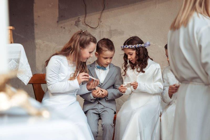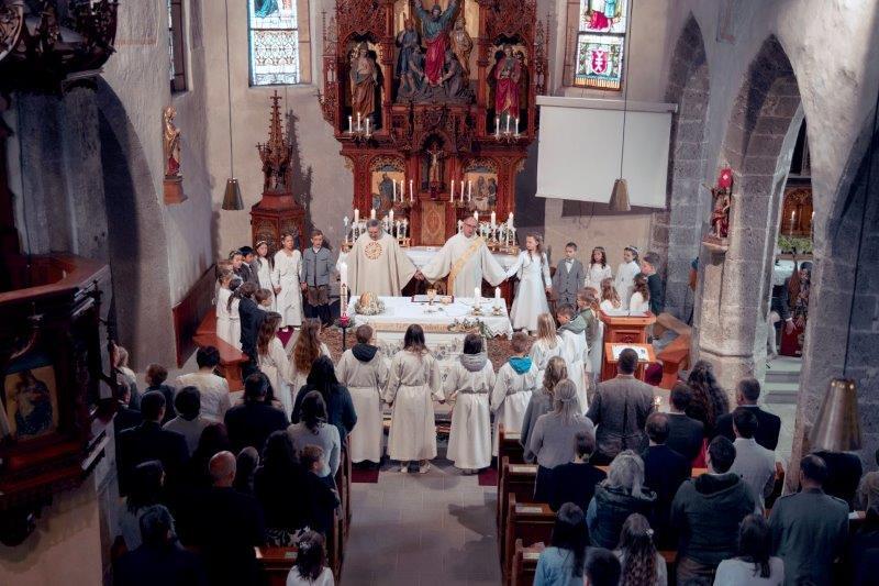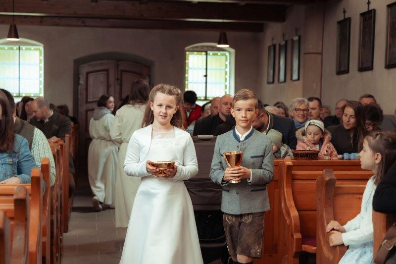 Auch wenn es morgens noch regnete, zum Fest hatte es aufgehört und zum Fotografieren strahlte sogar die Sonne mit den Kindern um die Wette. Zur Kirche begleitete die Trachtenmusikkapelle die Kinder, dort hatte Helga Bleiner eine Musikgruppe mit Vätern und Geschwistern der EK-Kinder zusammengestellt, die den Gesang der Kinder und Gemeinde unterstützten.